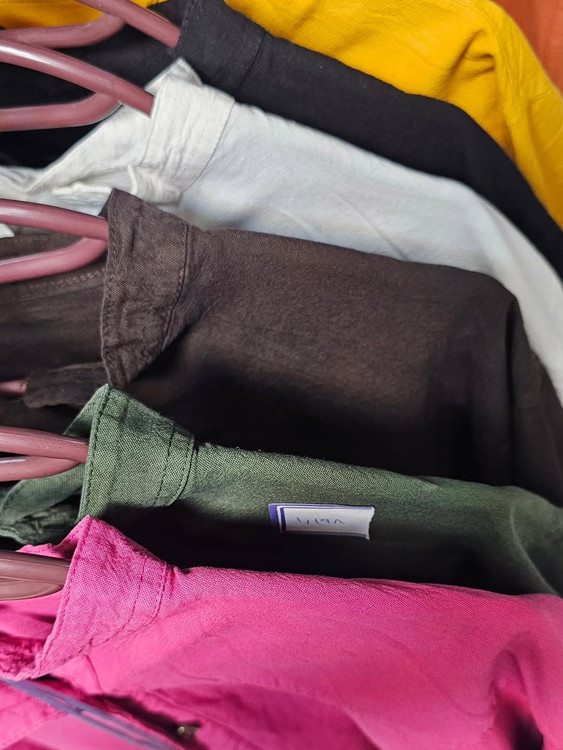شومیز الیاف طبیعی بدون آبرفت و رنگدهی در رنگبندی قهوه ای، مشکی، سفید، سبز، خردلی، صورتی و سبز یشمی مناسب تا سایز ۴۸.